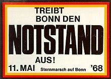 Als „die Notstandsgesetze“ im engeren Sinne werden die Grundgesetzänderungen bezeichnet, die am 30. Mai 1968 – in der Zeit der ersten Großen Koalition – vom Deutschen Bundestag und am 14. Juni vom Bundesrat verabschiedet sowie am 24. Juni 1968 von Bundespräsident Lübke unterzeichnet wurden. Außerdem wurde – bereits seit Ende der 1950er Jahre – eine ganze Reihe von sog. „einfachen“ (nicht-verfassungsändernden) Notstandsgesetzen verabschiedet. Die Beratungen über diese Gesetzespakete wurden von massiven Protesten der sogenannten Außerparlamentarischen Opposition (APO) begleitet. Die Notstandsgesetze änderten das Grundgesetz zum 17. Mal und fügten eine Notstandsverfassung ein, welche die Handlungsfähigkeit des Staates in Krisensituationen (Naturkatastrophe, Aufstand, Krieg) sichern soll.[